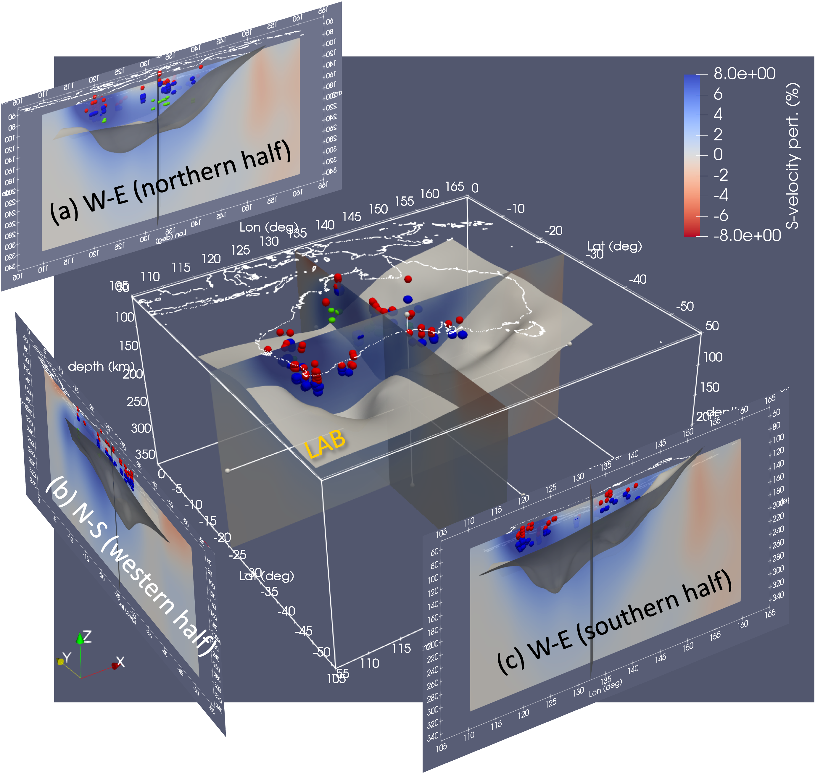 図1:豪州大陸下のLAB(グレーの面)と観測点下のリソスフェア内不連続面(赤・青・緑の点)