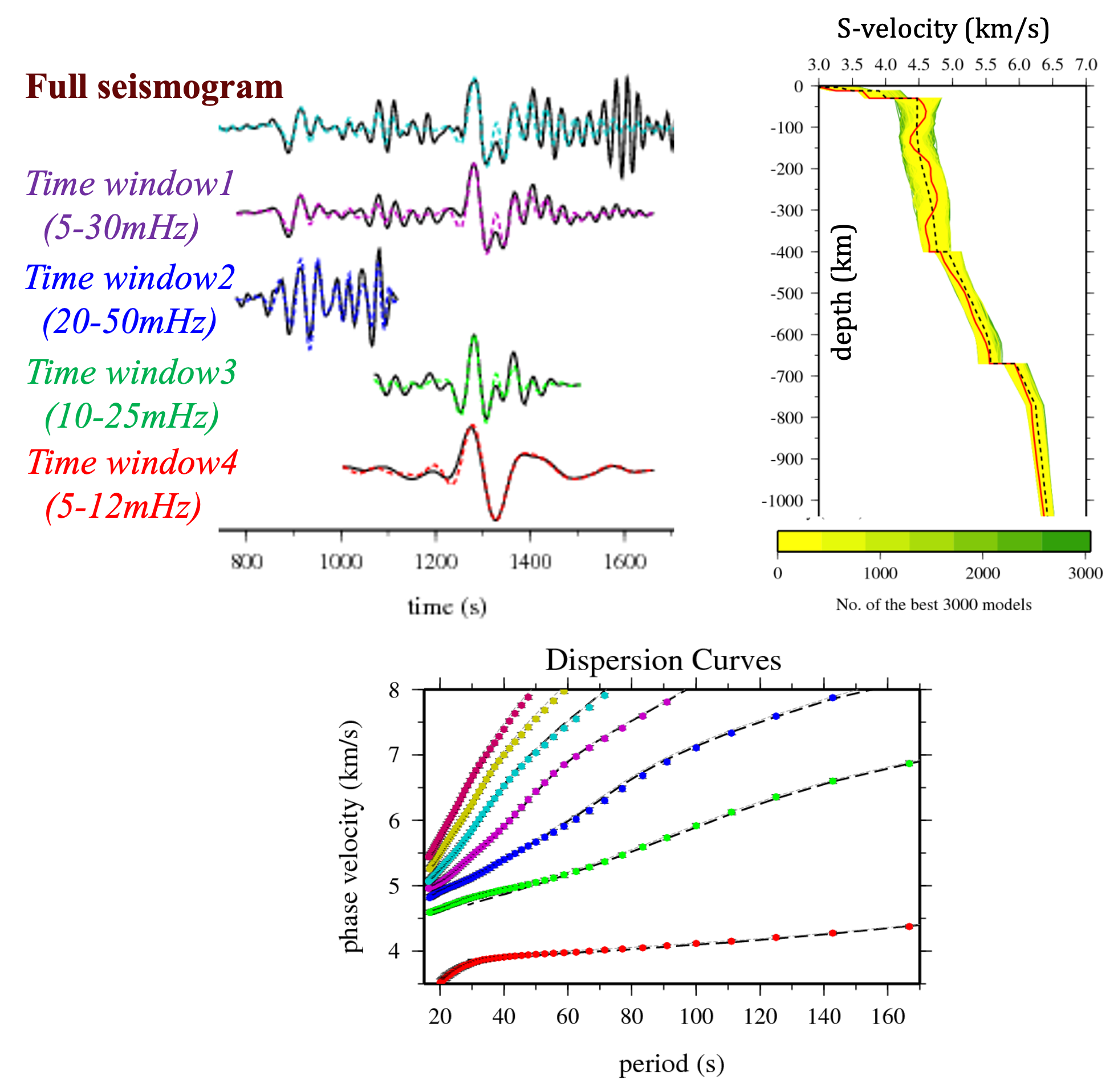 地震波には,発生源である震源の情報に加え,観測点までの伝播経路における地球内部構造の影響が含まれています.これらの情報を正しく抽出するためには,観測された地震波形に対する適切な解析が不可欠です.特に,実際の地震波形には,高次モードなど複数の波群が重なって到達する場合があります.当研究室では,様々な地震波形を用いて地球構造や震源過程を明らかにするため,一観測点での非線形解析法や,多数の観測点を用いたアレイ解析法など,独自の解析手法の開発と応用を進めています.